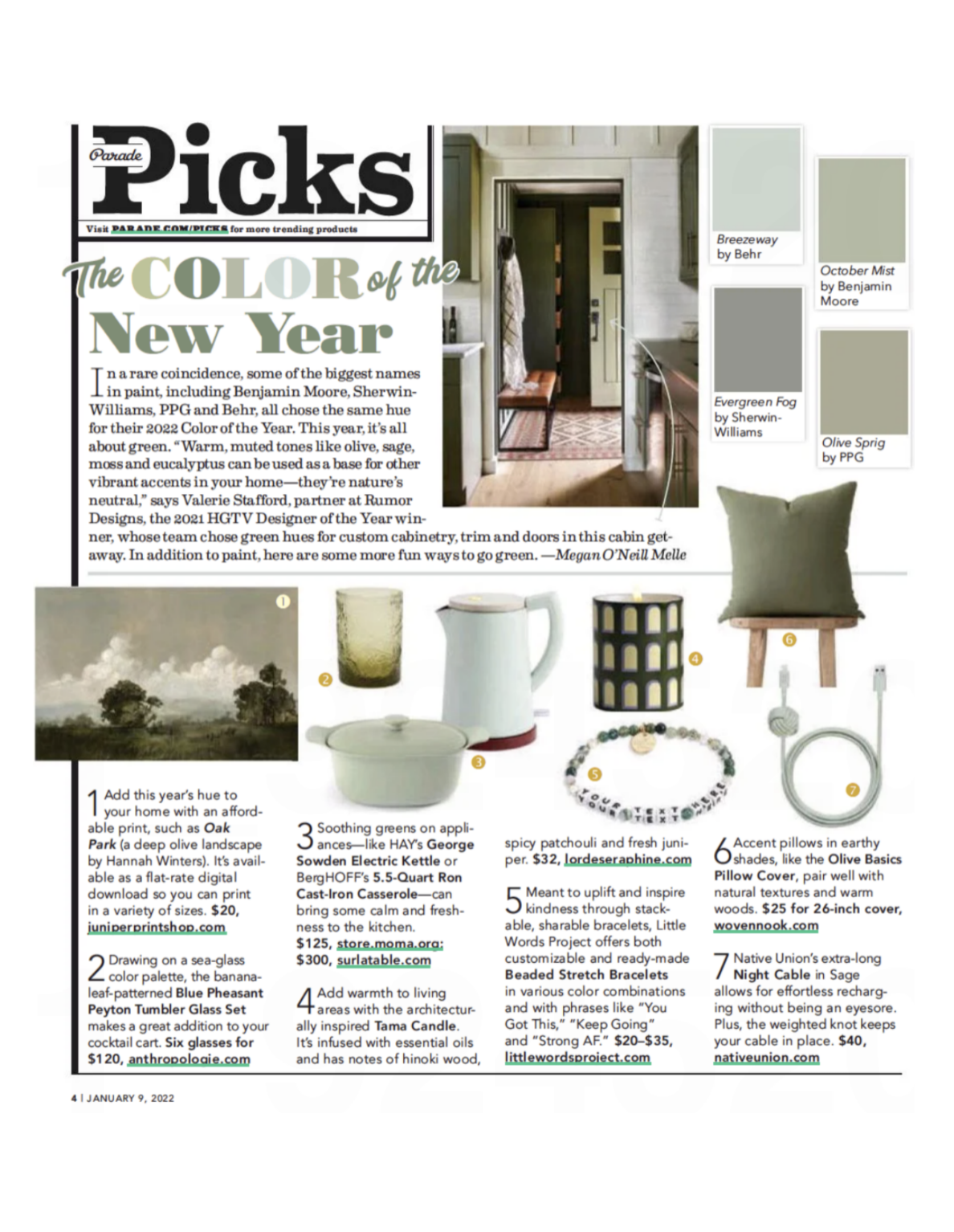 In a rare coincidence, some of the biggest names in paint, including Benjamin Moore, Sherwin Williams, PPG, and Behr, all chose the same hue for their 2022 Color of the Year. This year, it’s all about green. “Warm, muted tones like olive, sage, moss, and eucalyptus can be used as a base for other vibrant accents in your home- they’re nature’s neutral,” says Valerie Stafford, partner at Rumor Designs, the 2021 HGTV Designer of the Year winner, whose team chose green hues for custom cabinetry, trim and doors in this cabin get-away. In addition to paint, here are some more fun ways to go green. - Megan O’Neill Melle